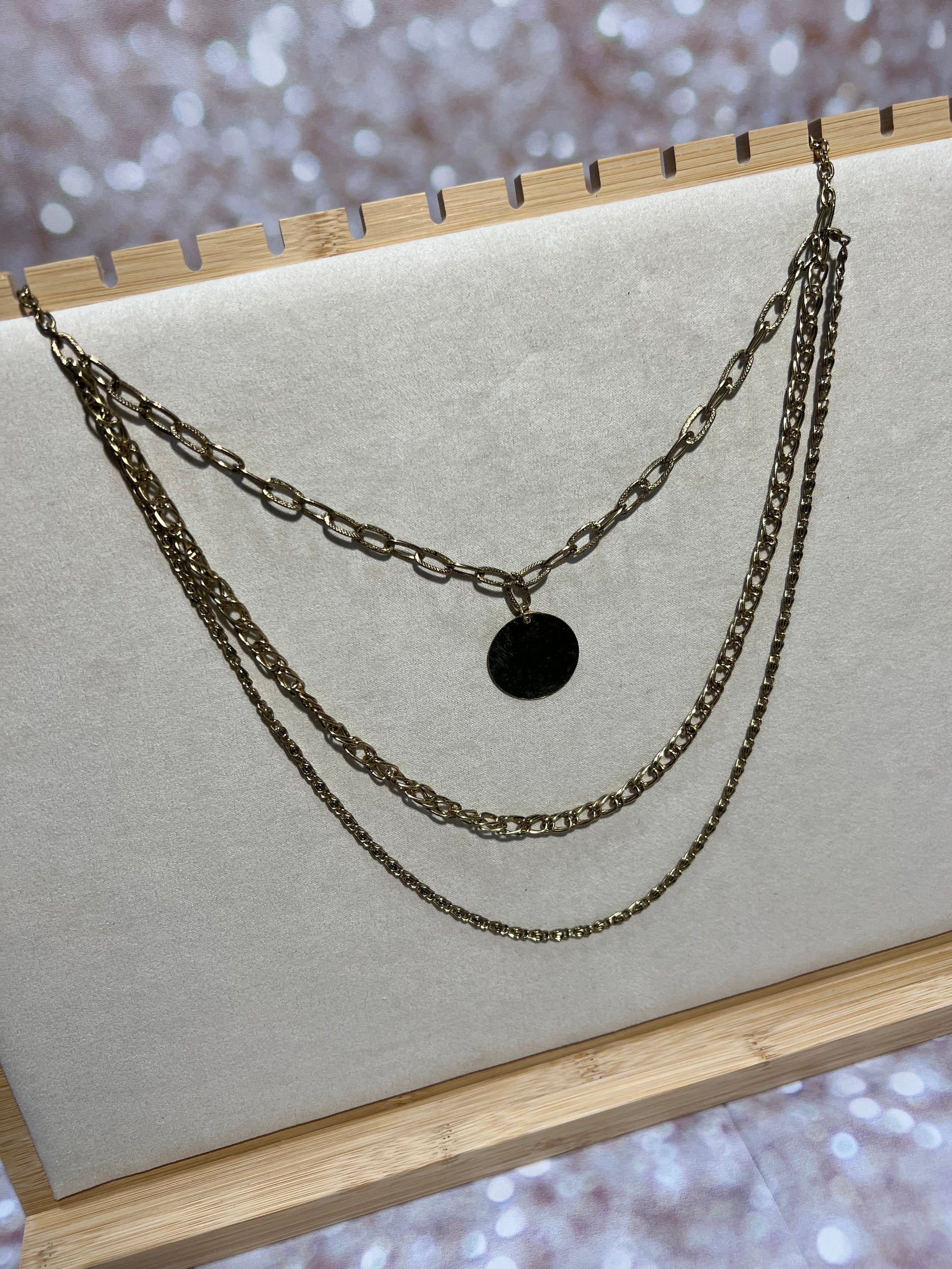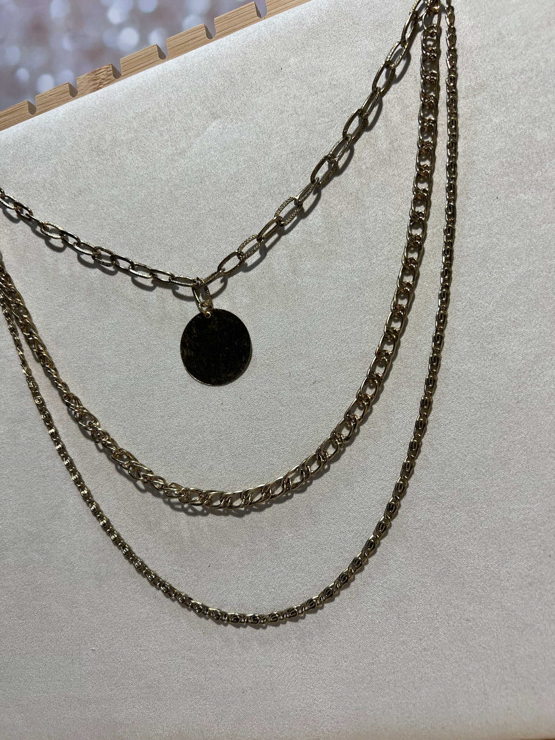 This 32" gold multi-strand chain necklace is intricately designed with stacked circle pendant, creating a timeless look. Crafted with superior material, it is lead and nickel free to keep you comfortable and stylish. A perfect accessory for any occasion.