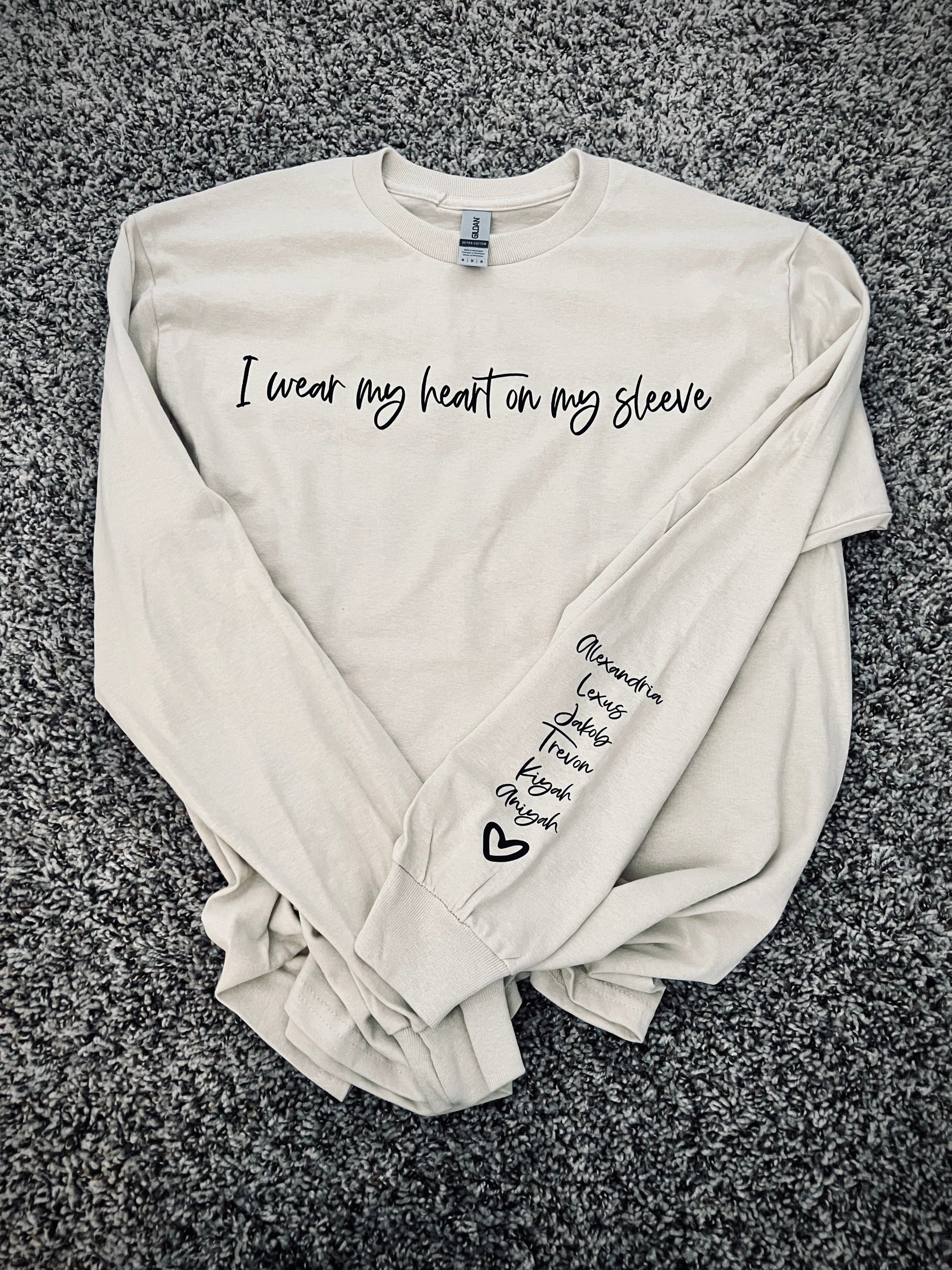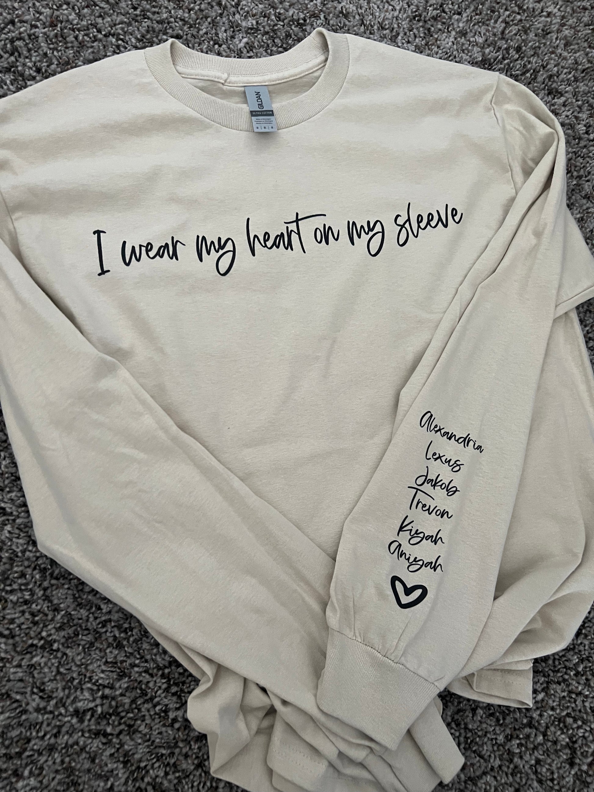 Stay stylish and comfortable with I Wear My Heart.🖤This custom Sand colored Gildan long sleeve is perfect for casual wear. The minimalistic design features a classic fit and feel that's sure to keep you cozy for hours. The perfect addition to any wardrobe.
