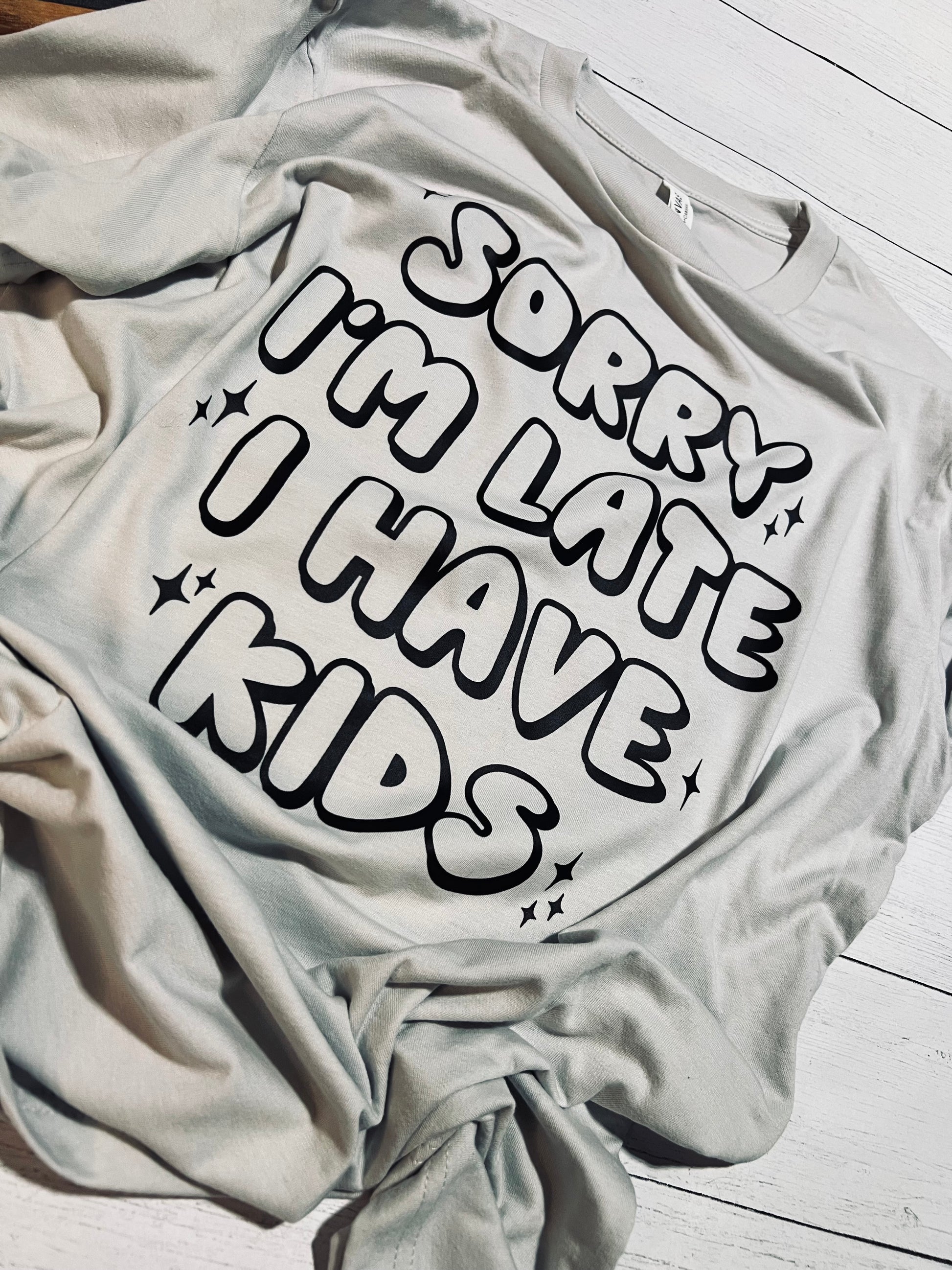 Be fashionably late with Sorry I'm Late I have Kids! This shirt is perfect for busy parents, with its bold statement and final sale status. Don't apologize for your kids, embrace the chaos in style!