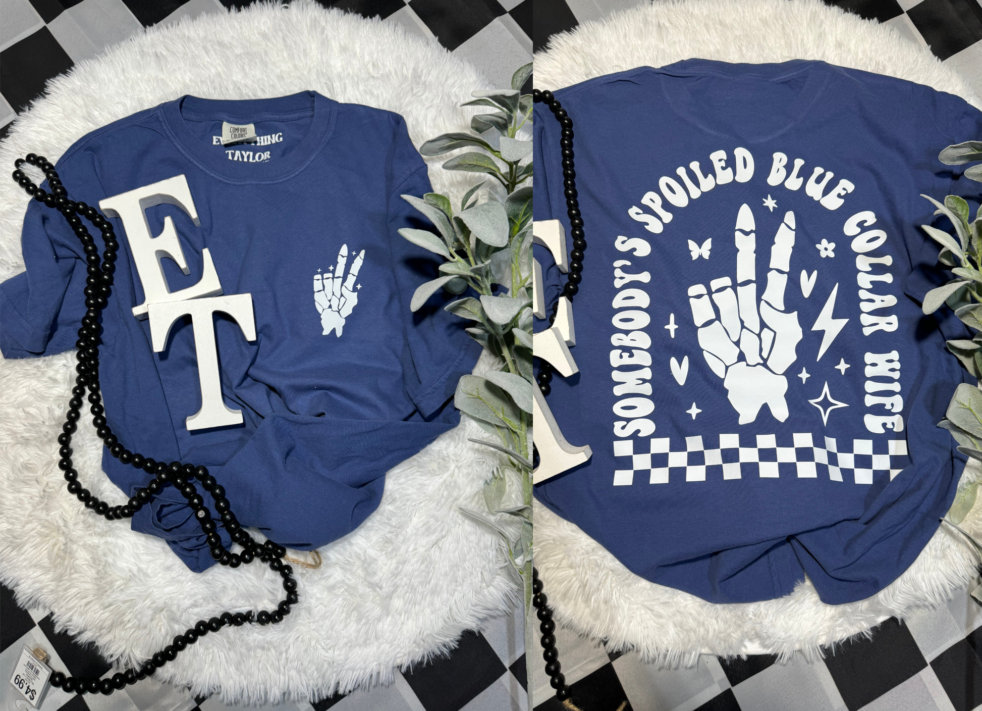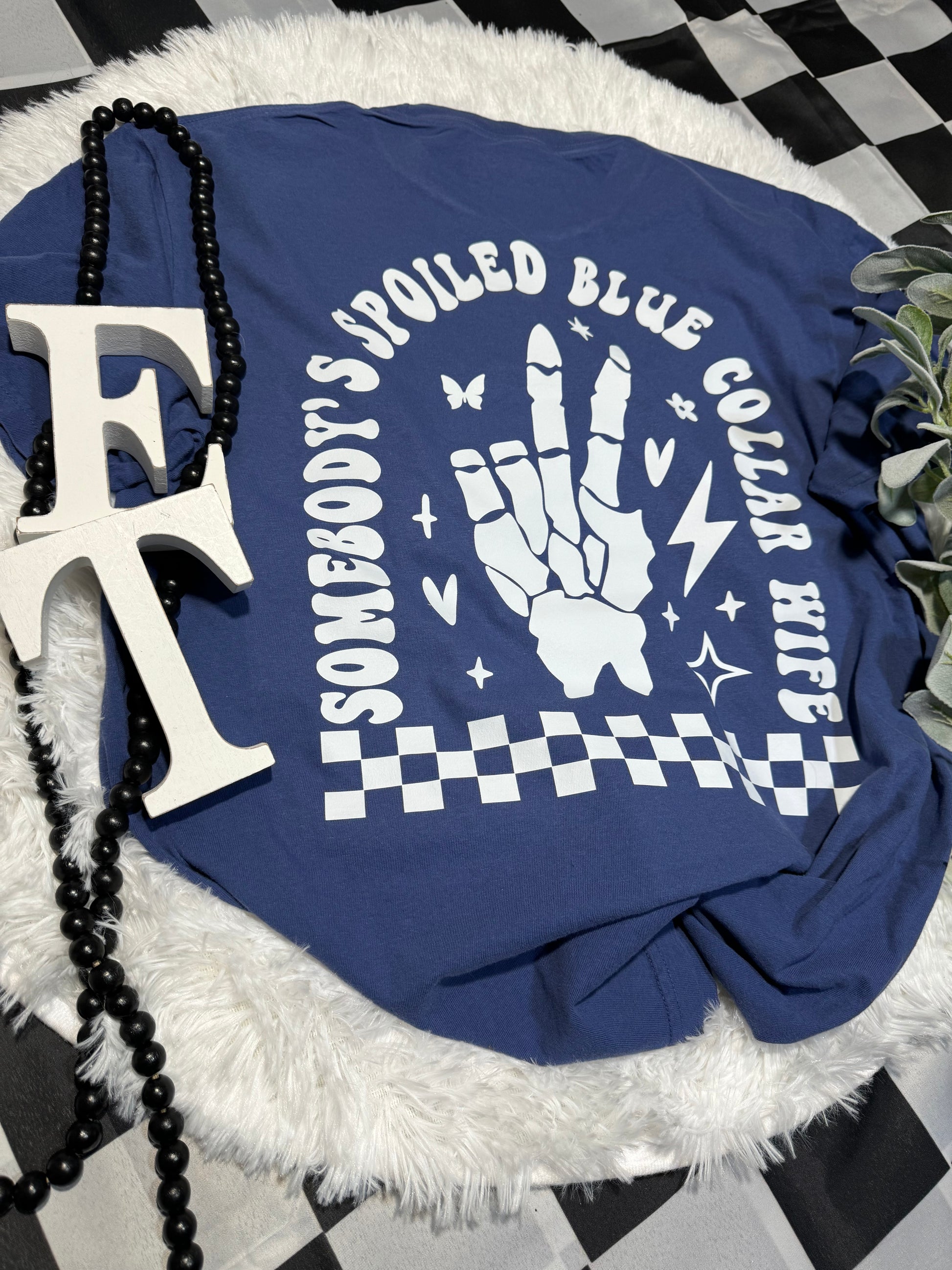 Spoil yourself or a loved one with our comfortable and stylish Somebody's Spoiled Blue Collar Wife tee. Made for those who help support the ones that go out and do those hard jobs. Perfect for casual wear and showing off your pride and love for the blue collar life.